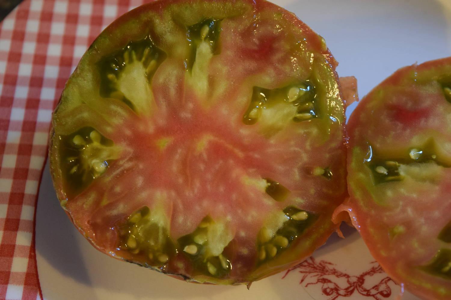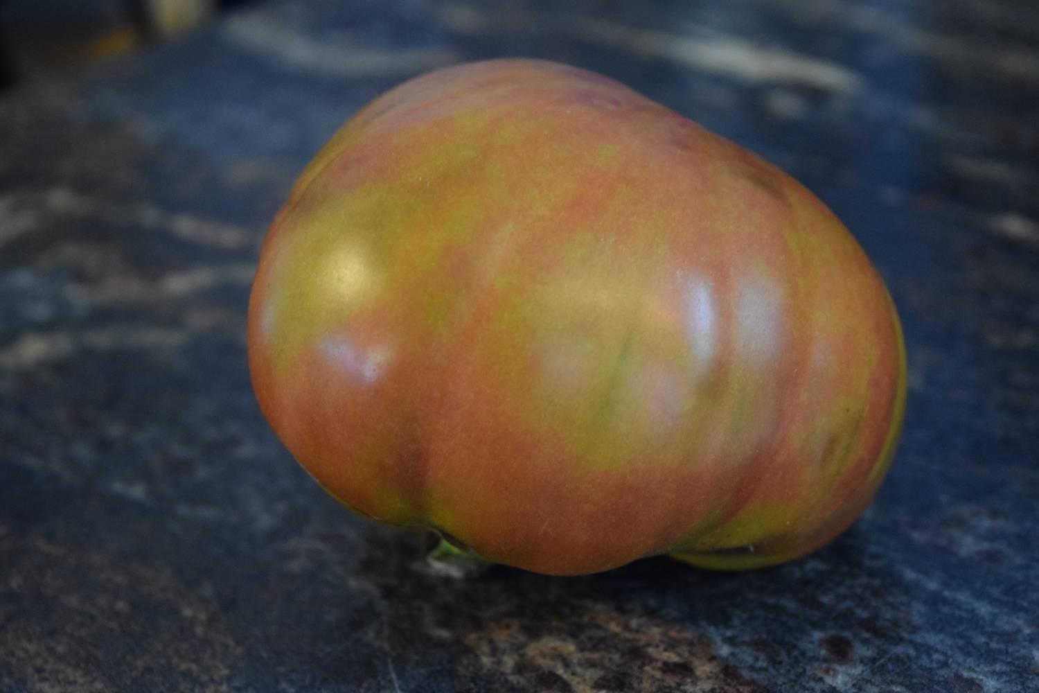 This very attractive bi-color tomato is a green, yellow and purple mix with a flesh that is bright green with deep red streaks. Slices are stunning. It has excellent flavor that is very highly rated, both sweet and smoky with a hint of citrus. Beefsteak fruits are very large and weigh in at about 1 1/2 lbs. The plants are very heavy producers. This tomato is tender so does not keep long. Make sure you eat soon after picking. One of my favorites!