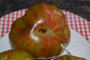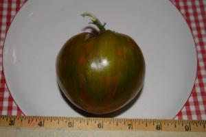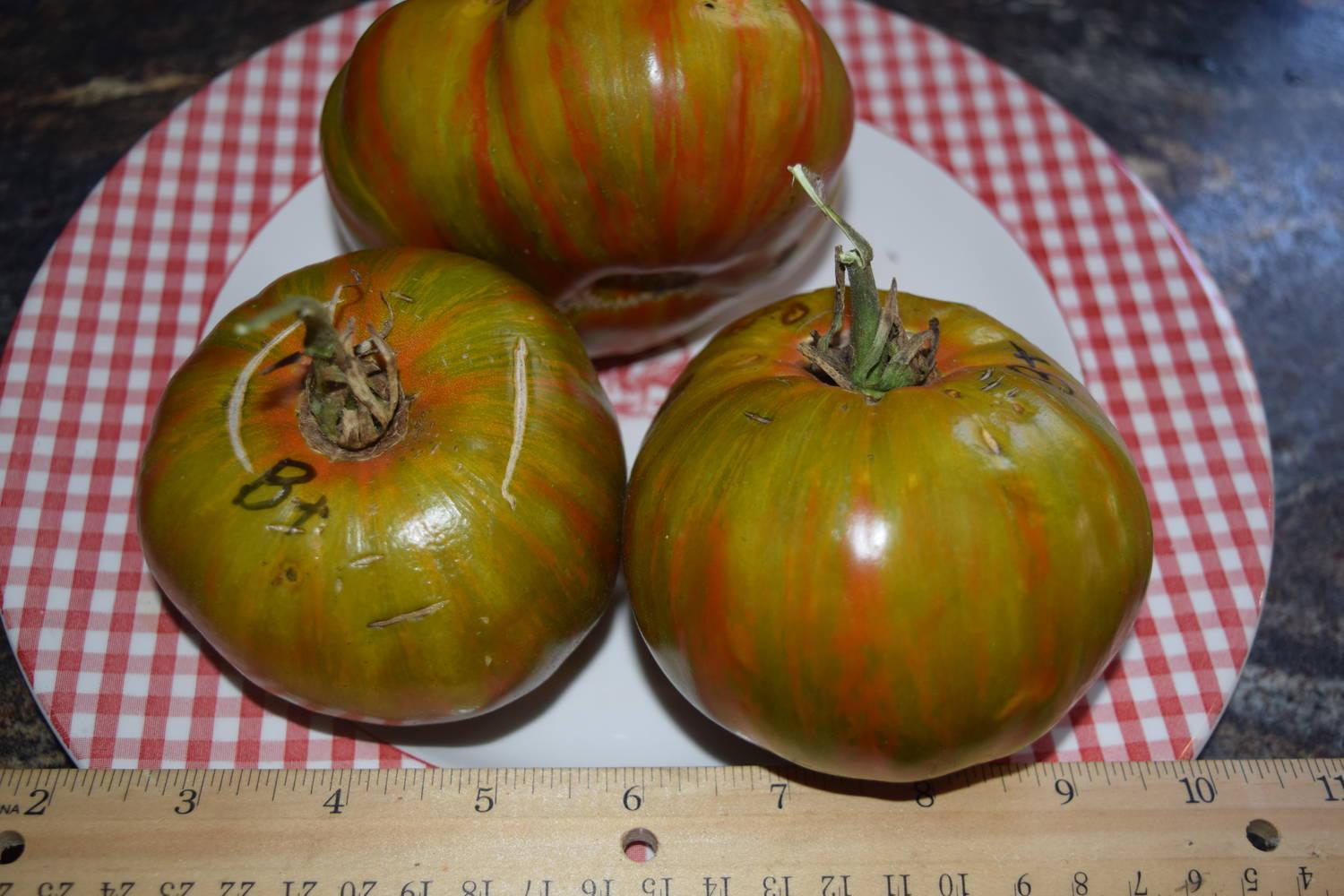 Wow! This tomato has extremely striking green fruit with yellow and red stripes. Fruits have the usual green when ripe creamy green flesh inside with streaks of various shades of red and yellow. Each of these colors has a different flavor resulting in a spicy, sweet, and tart tomato all in one. The plants produce 8-16 oz. beefsteak type tomatoes, with fair to good production. One of my favorites. Beautiful and tastes good. It is one of top heirloom tomatoes for flavor for a reason.