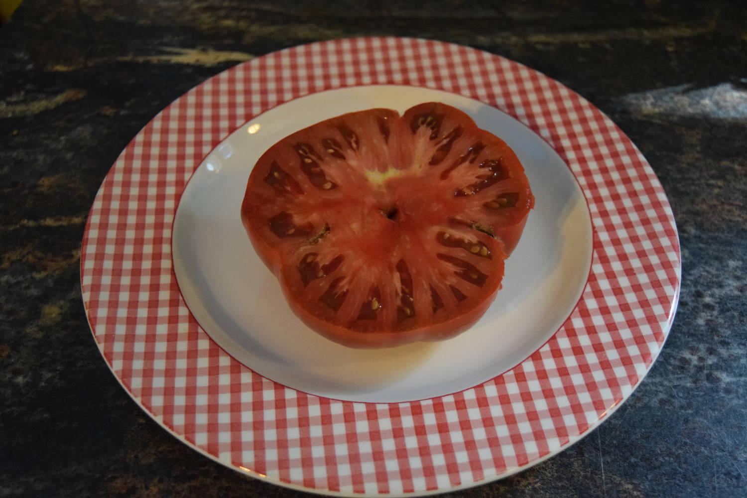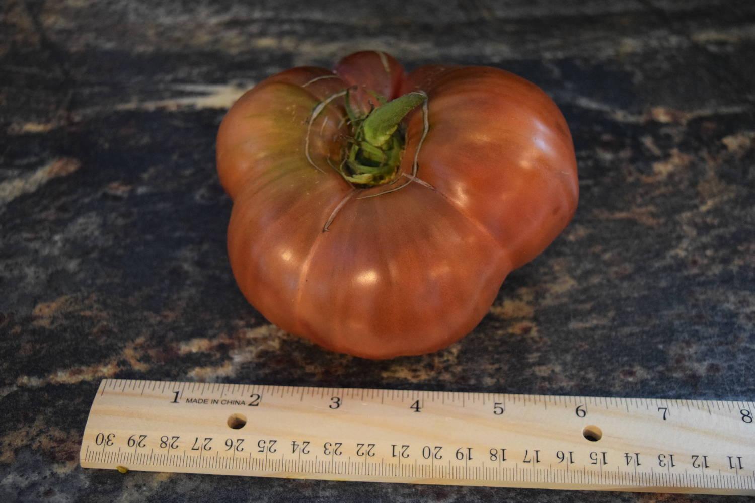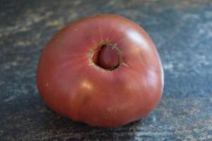 Contrary to the name it is more of a medium sized beefsteak that can vary in size from 6-12 oz. The color is a purplish black with the usual green shoulders that may have some concentric cracking. It is a hardy variety from Russia where so many of the dark tomatoes come from. Maturity is quite early with very good production. The flavor is excellent – highly recommended.