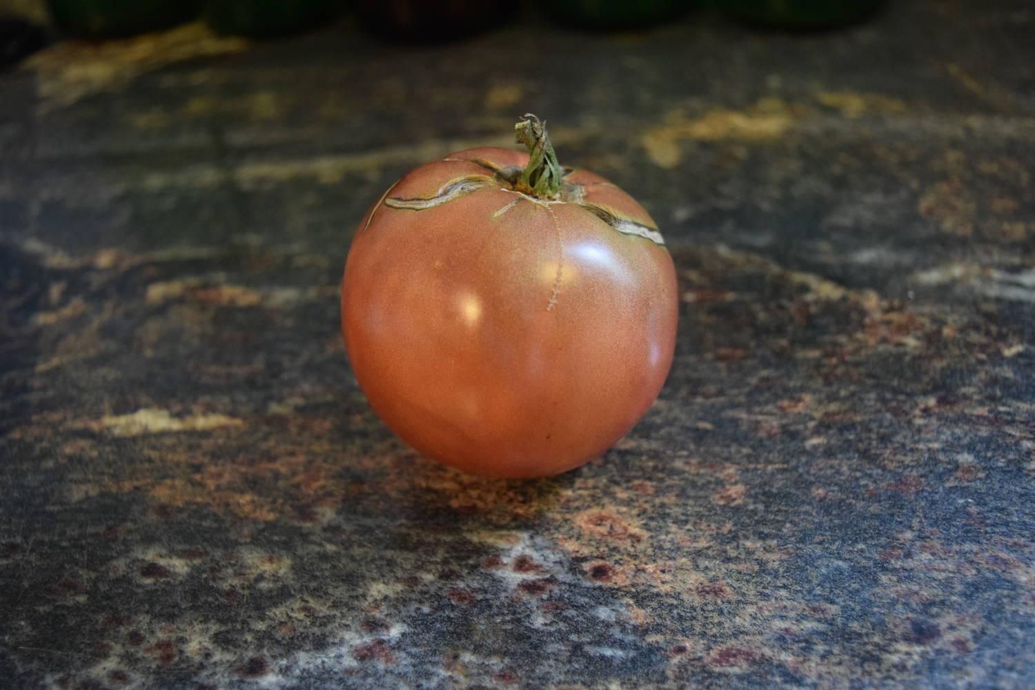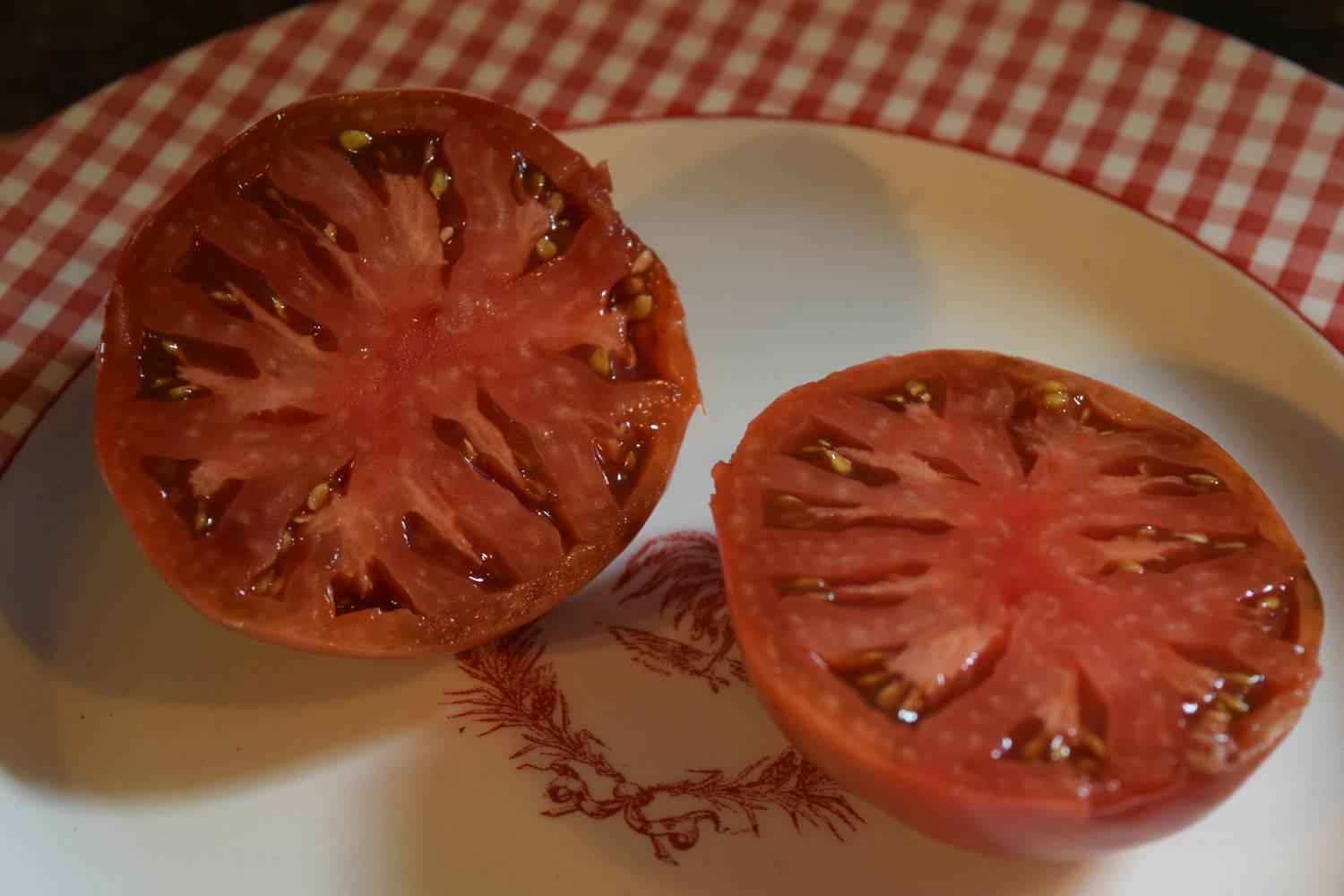 This is the tomato that is known for it’s intense flavor – dark, smoky, sweet and has won many taste awards. It is very beautiful, being probably the darkest of the darks. Size is medium to large, 8-16 oz, and fruit are smooth and mostly crack free. When cut, it is both deep red and green inside. Excellent!