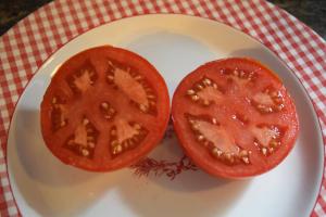 This is a classic American tomato – red and large! The flavor is very good – rich and tomatoey. Size ranges from 12 -18 oz and can get very large if pruned and worked with. It has very good production and the fruit rarely crack. Nice!