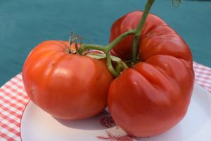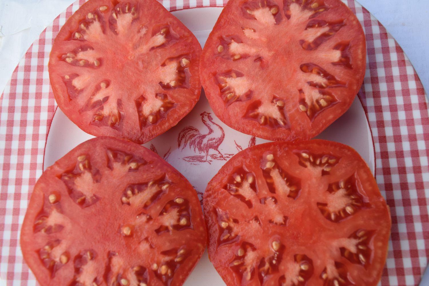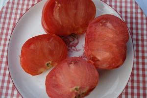 This was a cross done by the one and only Bill Jeffers – breeder extraordinary - of Brandywine and Neves Azorean Red back in 2006. He gave seed to Tom Micholas who gave seed the next year to Ray Newstead (of Earthtainer fame) who grew out for a couple of years and gave seed to Marianne Jones who stabilized it in Dickson, TN. (Almost makes you dizzy). With the help of Bill, she named it Dixiewine.