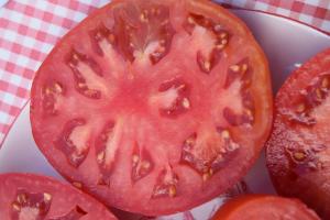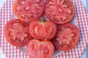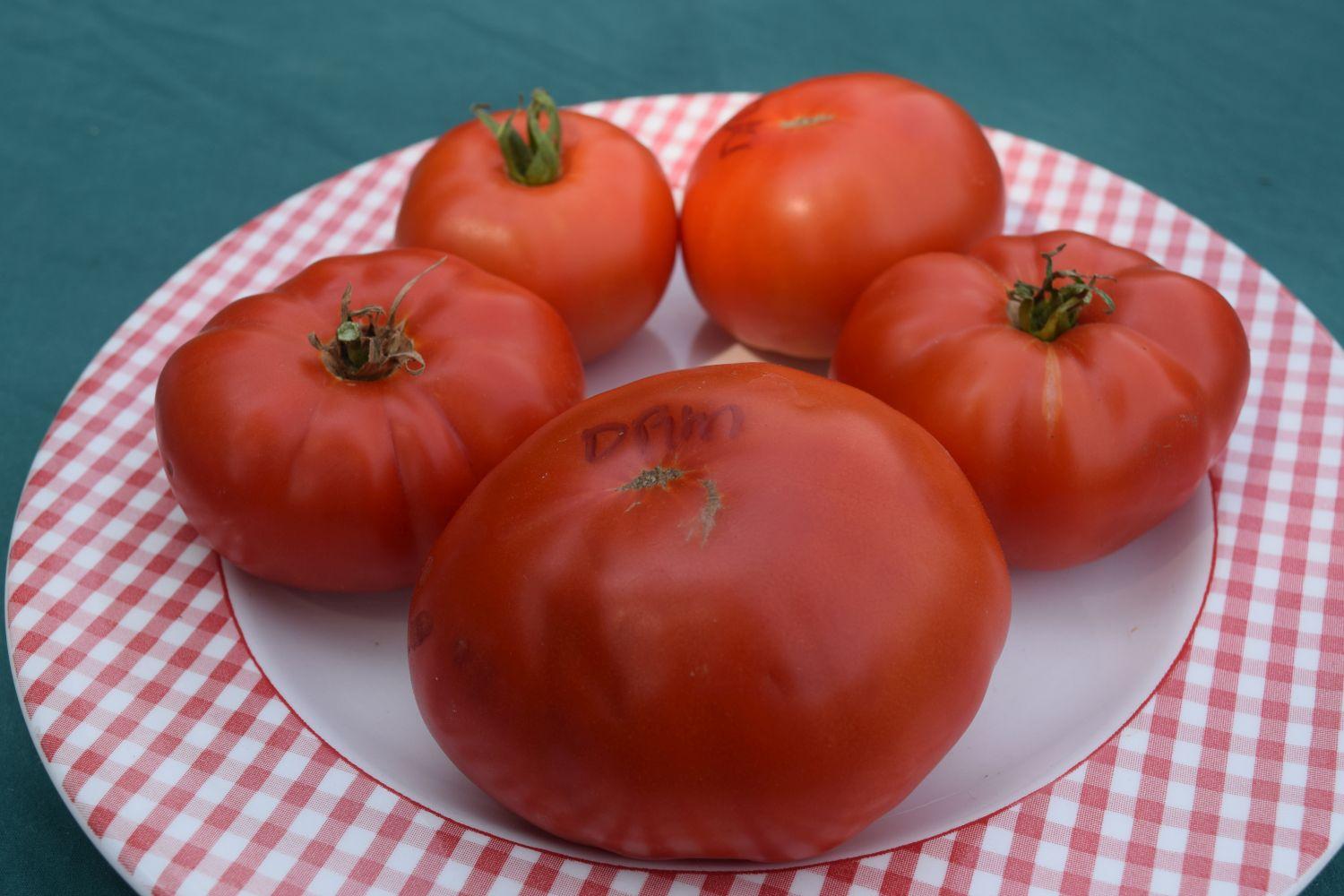 A rare red beefsteak with smooth shoulders and almost no cracking. Juicy with a well balanced flavor. Fruit average 5-9 oz. Very nice!