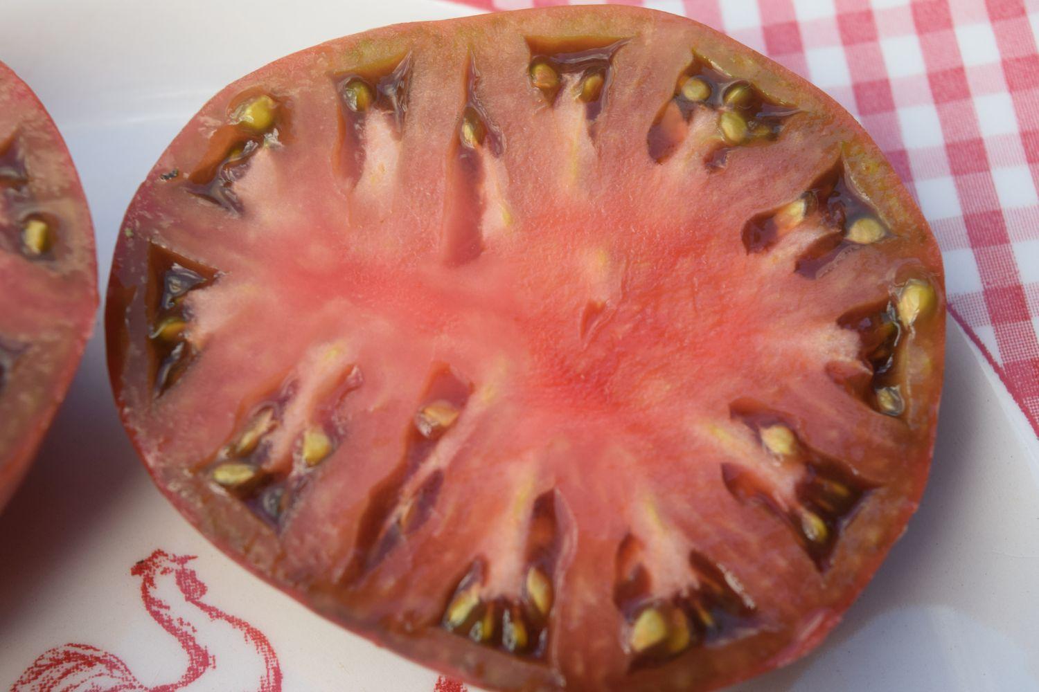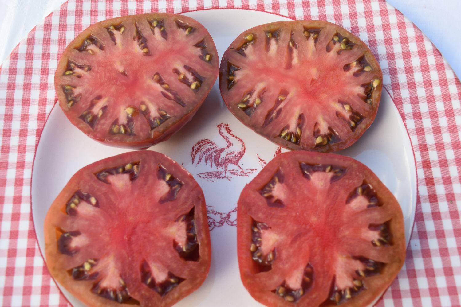 A very rare variegated sport of Cherokee Purple. The leaves will show more variegation in the cooler weather. First fruit will be larger and gradually lessen in size. They have an excellent flavor as they are basically Cherokee Purples with special leaves. The interior when cut has an incredible deep color – very pretty. Production was really good.