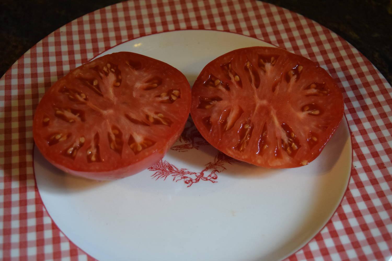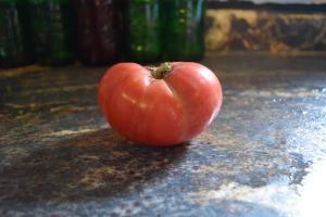 One of the sweetest and largest deep pink tomatoes. It is so sweet that some people make wine from it! Fruits are very meaty with few seeds and very low acid in flavor. The bottoms are very smooth and can grow to be over 2 lbs but most are usually around a lb which is still very large. The plant is very vigorous and it takes a while before it sets fruit.