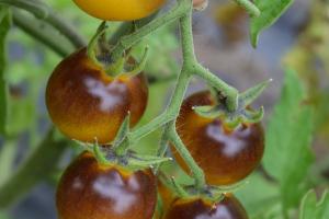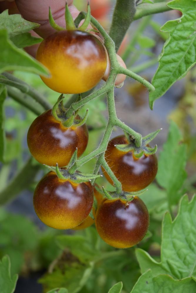Another winner from Brad Gates. Beautiful cherry tomatoes that start out purple and turn yellow as they ripen with a pretty purple anthocyanin blush. Sweet and creamy fruit with plenty of production. Nicely crack resistant.