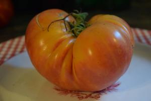 In growing out Brandywine in 1997 (from seed saved in 1993), Craig LeHoullier noted a number of regular leaf seedlings. Unsure if this was a cross or mix up, he grew out one plant, which produced large, oblate pink fruit with distinct vertical gold stripes - a very unusual result.
