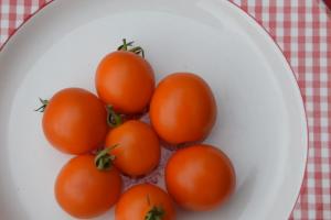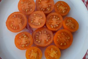 A nice bright orange large cherry averaging 2 oz and about 1 ½”. Great in salads! Also makes nice dried tomatoes. The fruit are blemish free and the plant is very productive. This is not a super sweet tomato even though it’s orange like Sungold. It has a more tomatoey flavor with a slight tang.
