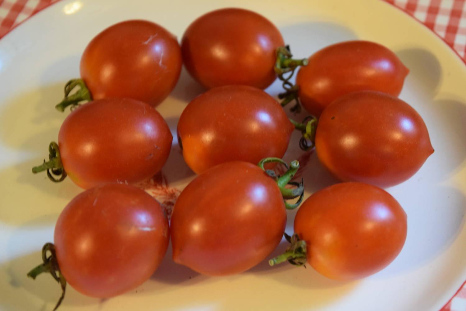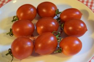 A very productive dark red cherry of about 1 ½ inches with a distinct point on the end. Nice rich, intense flavor. Great in salads and I’m thinking it would make a lovely roasted tomato sauce.