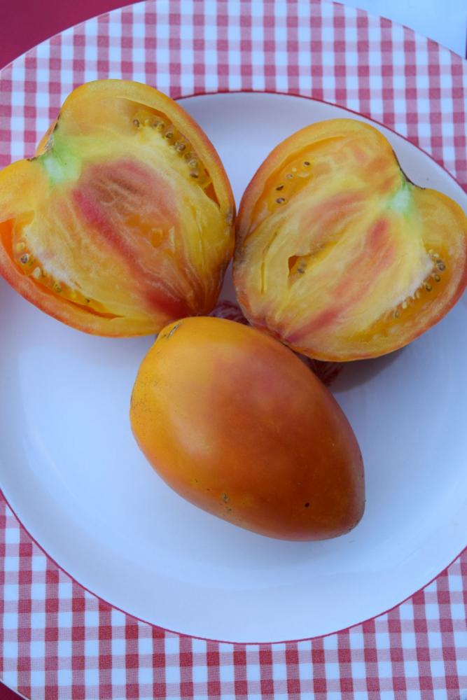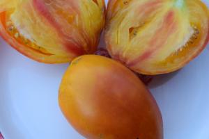 A very pretty bi color heart tomato that is golden yellow/orange with pink marbling. Plants give a good yield of about 8 oz, up to a pound, meaty fruit that are stunning when sliced. Flavor is excellent, rather sweet and not real intense but not too mild, either. Wonderful for sandwiches or just plain eating. Definitely worth the wait.