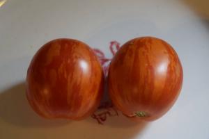 Yellow striped red fruits of golf ball size are as good tasting as they look. The vines are large, fast growing, require staking and are very productive. Get this variety if you want lots of tomatoes. This also is a rare variety we are glad to be able to add to our collection.