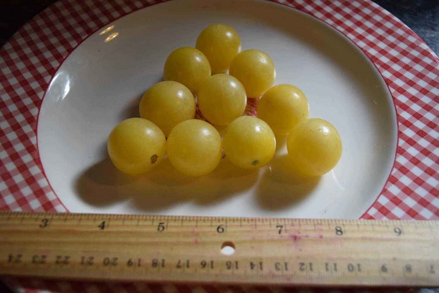 A pretty little white/pale yellow cherry with an excellent sweet fruity flavor and about 1” in diameter. Some people like the flavor of the fruit at both the white and the pale yellow (riper) stage. The fruit rarely have issues with cracking. The plants are very vigorous and productive. This one is lovely added to a bowl of mixed color cherries.