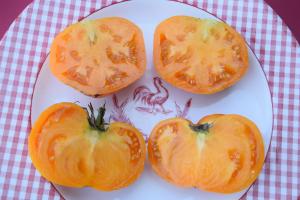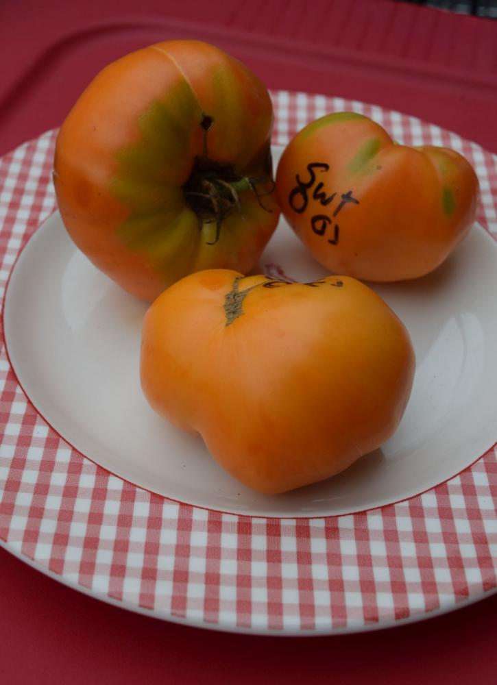 This is a brand new, not even available commercially, tomato from a fellow member of the tomato forum. It is a wonderful solid blunt heart tomato. That means it is similar in shape to a beefsteak but with a bit of a point on the blossom end. They are a lovely bright orange in color and nice and meaty with very few seeds.