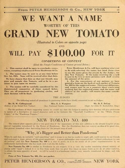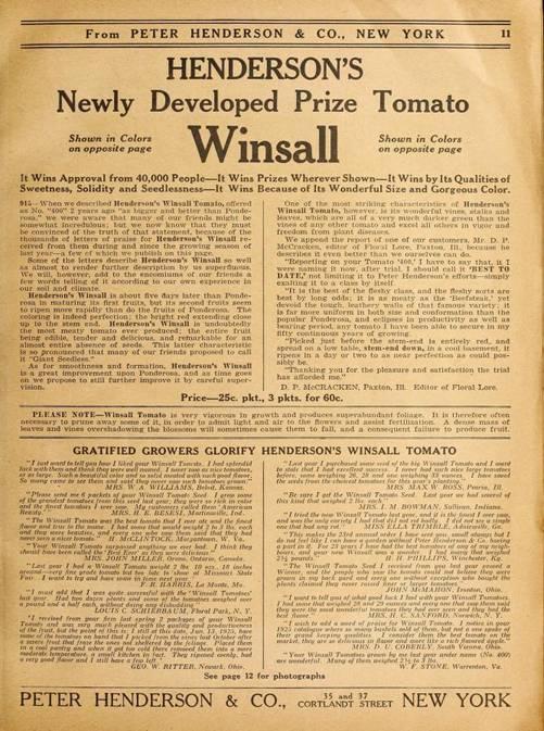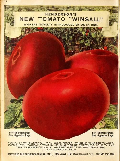 Peter Henderson & Co. made improvements to Ponderosa and had a naming contest for it in 1924. Winsall was the name chosen. Here are pages from the Peter Henderson & Co. “Everything for the Garden” catalogs from 1924 and 1926 showing the contest and the winner. I love reading these old seed catalogs.